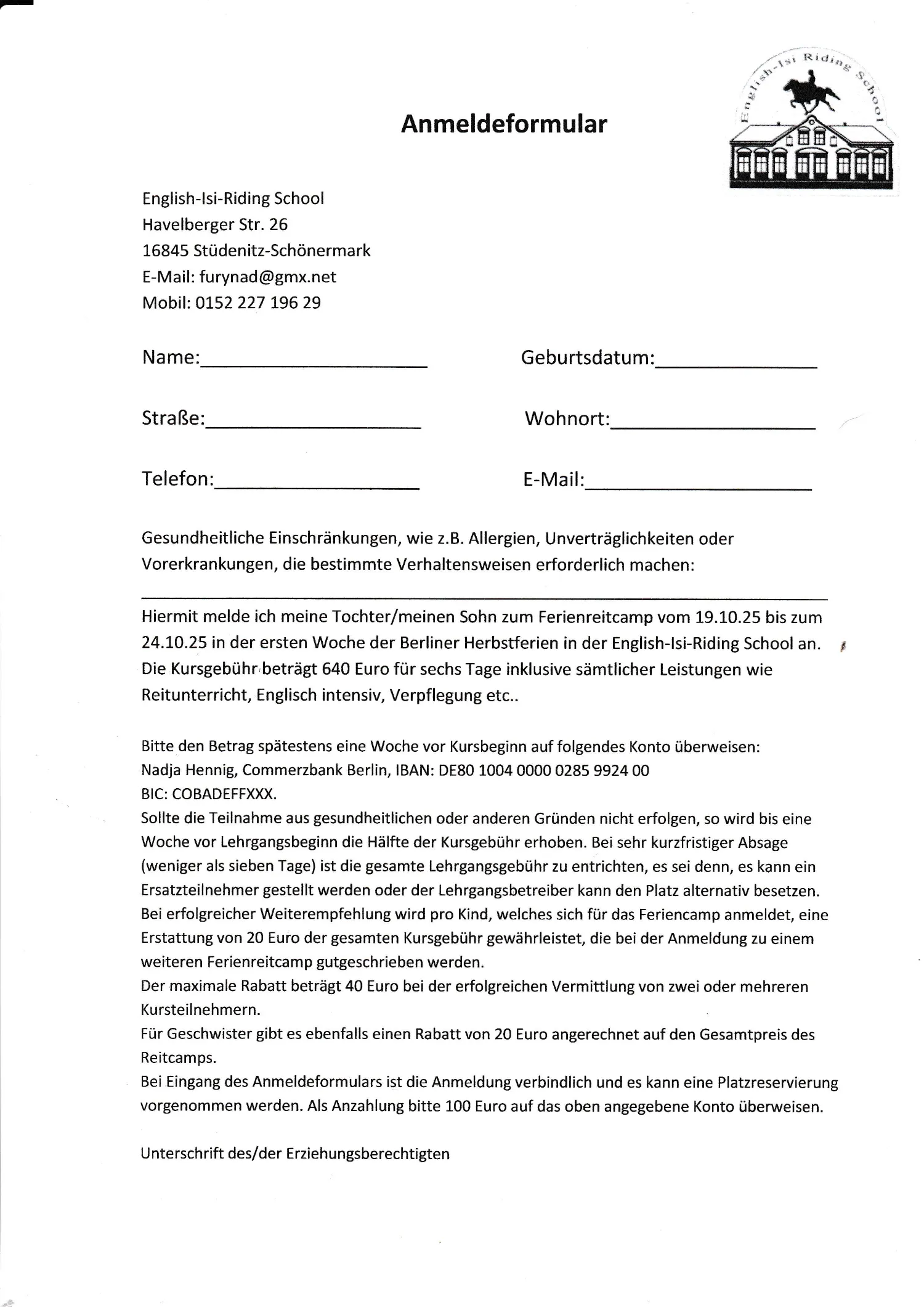 1. Ferienreitcamp mit Englisch: Sonntag, 19.10.2025 – Freitag, 24.10.2025, sechstägig, Preis: 640 Euro, mit Reitabzeichenprüfung bis Samstag, 25.10.2025, siebentägig, Preis: 695 Euro zuzüglich 70 Euro Prüfungsgebühr